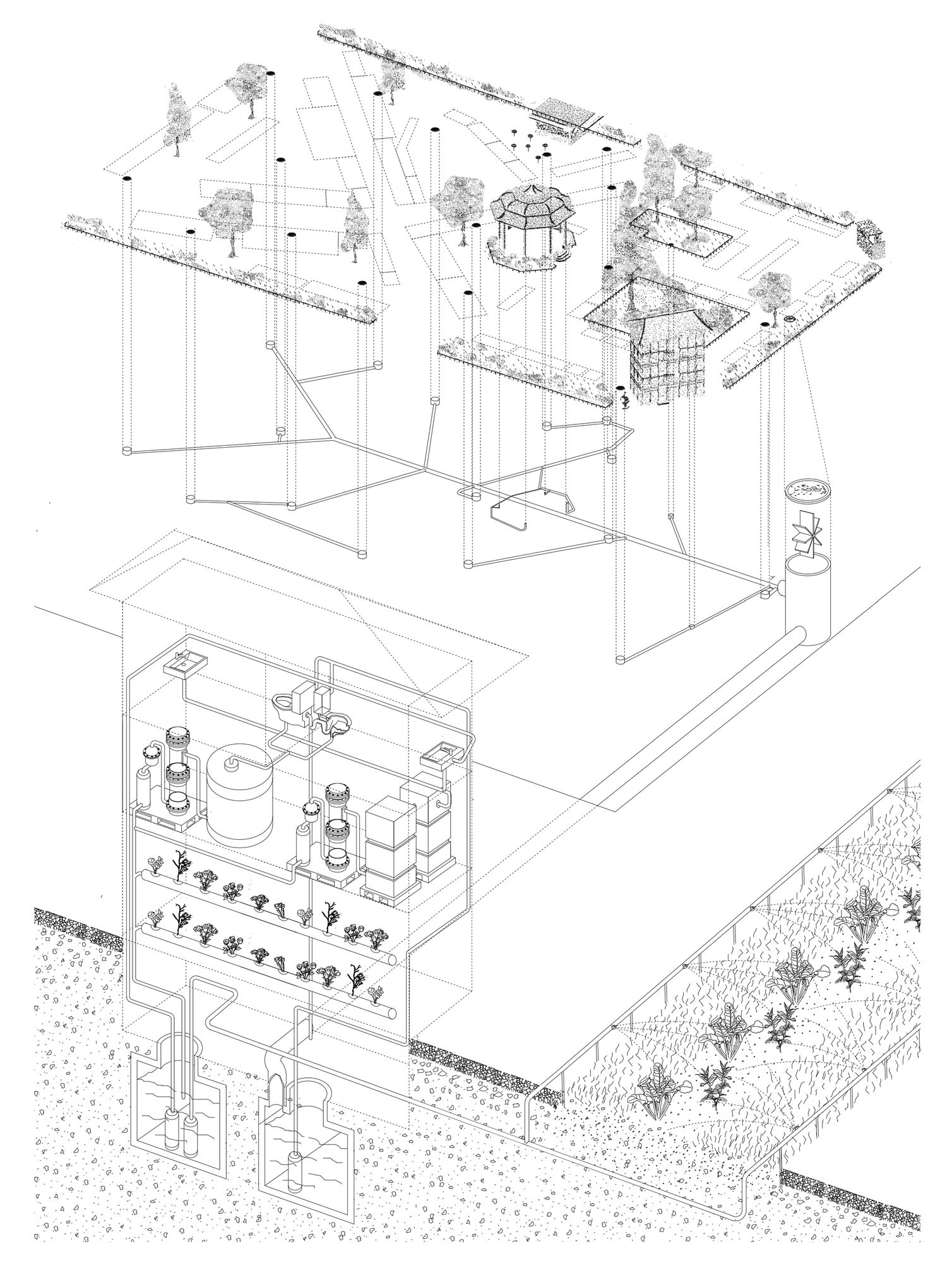 The project imagines a symbiotic relationship between the two, which is dictated by the flows of water.