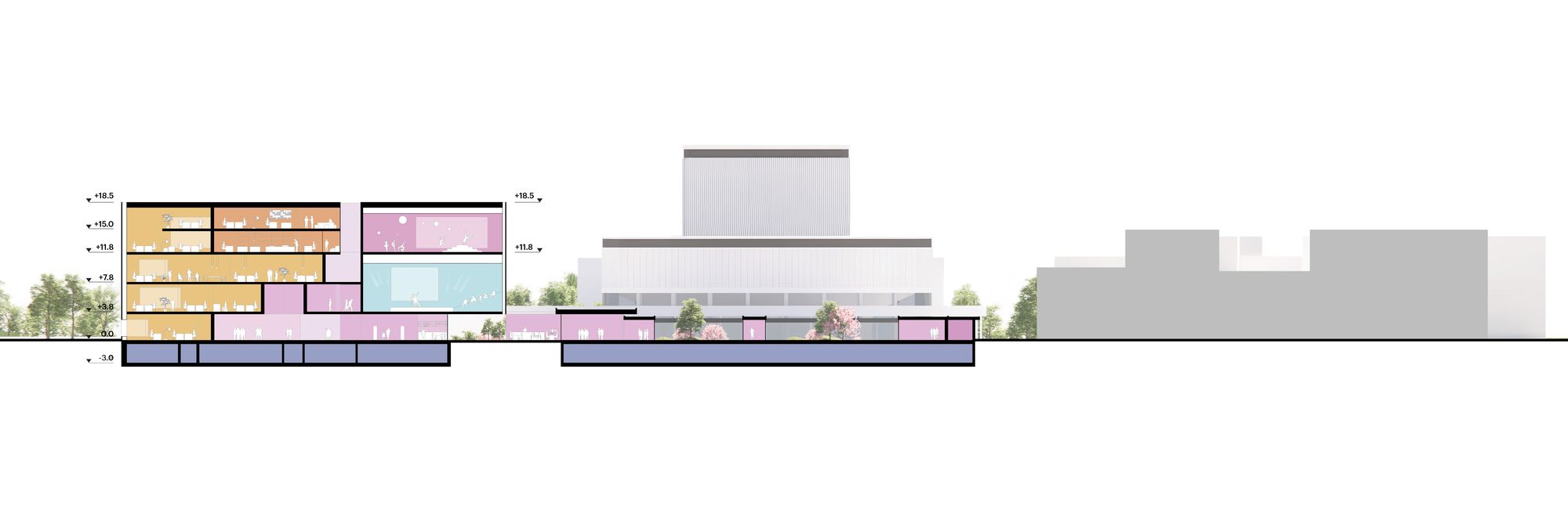 The centrepiece of the design is a cultural canyon where the different uses of the building clash and the visitor becomes a performer.